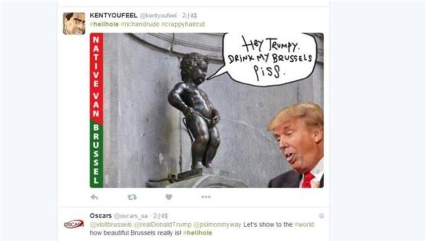 特朗普指称现在的布鲁塞尔如同地狱,让比利时民众大为不满。网民纷纷在社交网站上传图反讽特朗普。【环球网综合报道】据台湾“中央社”1月27日报道,美国共和党总统参选人特朗普在为禁止穆斯林入美政策辩护时,以布鲁塞尔为例称现在的布鲁塞尔不再美丽,反而像是“地狱”。他这番言论让比利时民众大为不满,大家纷纷在社交网站上反击特朗普言论。据报道,特朗普日前接受福克斯财经新闻网《Mornings with Maria》访问,当谈及他主张全面禁止穆斯林进入美国时以,他布鲁塞尔为例称,约20年前他曾经到过这里,那是个美丽的城市,一切都是如此美丽,但现在却“像地狱一般”。 巴黎恐怖攻击事件多名嫌犯出身大布鲁塞尔区,特朗普的说法显然是暗指比利时对穆斯林太过友善才会让布鲁塞尔背负“圣战士摇篮”的恶名。不过,特朗普的说法在经过媒体报道之后,引发比利时民众不满,许多人在推特上以#hellhole为名反击。一张尿尿小童攻击特朗普的照片在网络上大量被转载,许多网友也放上各式老鼠照片,暗喻特朗普是只人人喊打的过街老鼠。不少网友也放上布鲁塞尔知名的巧克力、松饼与啤酒告诉特朗普,“地狱”的美食其实不错。当然被誉为全球最漂亮广场的布鲁塞尔大广场、原子塔等布鲁塞尔美景,也是网友猛传的照片。网友穆伦那伊(Lucas Demuelenaere)则以比利时闻名全球的国家足球队“红魔鬼”的照片“佐证”特朗普的话说,特朗普你是对的,比利时真的是地狱。(实习编辑:胡雪梅 审核:谭利娅)