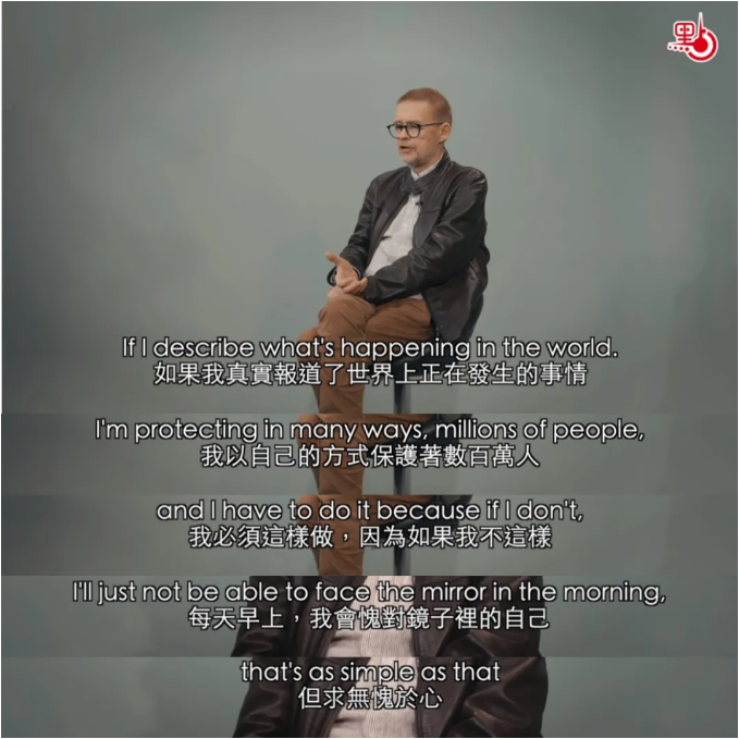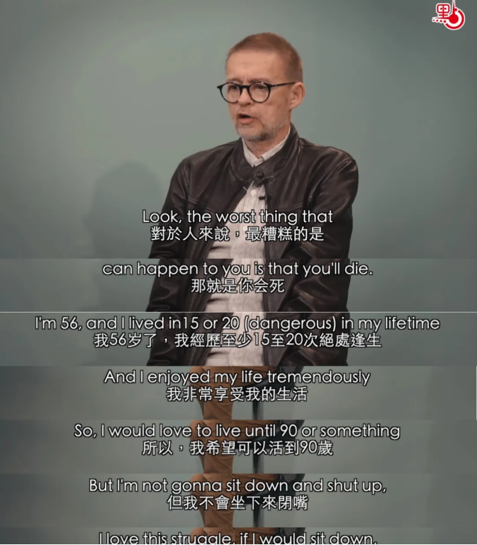 在被问道这样揭露事实会不会有生命危险时,他说,他想要活到90岁,但他不会为了能够苟活到寿终正寝而丢掉原则,即便是面对死亡的威胁,他也不会闭嘴不言。