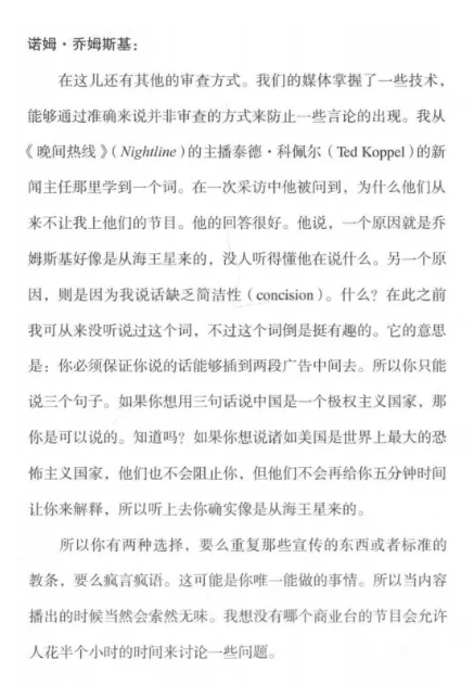 我们无法想象美国广播公司(ABC)、哥伦比亚广播公司(CBS)或者美国国家广播公司(NBC)在播出的时候会对资本主义或是西方议会制度的基础提出质疑。”