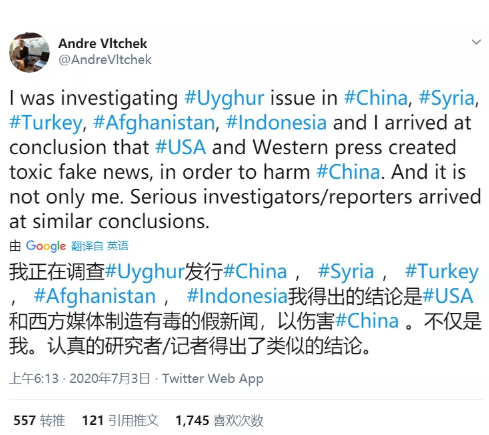 7月3日,他在自己的推特上说,西方媒体为了攻击中国在制造假新闻,除了他还有认真研究的记者得出了类似的结论。