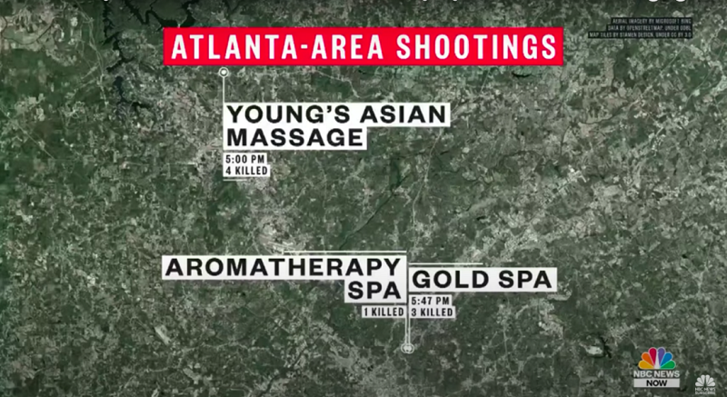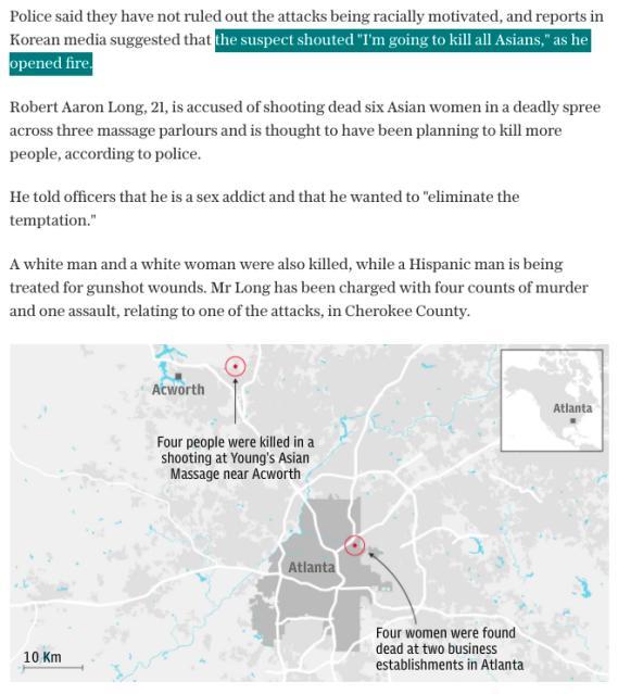 当天傍晚,21岁的白人男子罗伯特·艾伦·朗(Robert Aaron Long)先后在亚特兰大地区的三处由亚裔经营的按摩场所开枪行凶。造成8人死亡,其中6人为亚裔女性。据英国《每日电讯报》报道,有目击者称,艾伦·朗在开枪时曾高喊“我要杀光所有亚裔”。