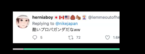 而广告展现的所谓“穿上耐克鞋就不被歧视”,更被日本民众看作是借着“政治正确”来“蹭热点”,以获取某种商业利益。