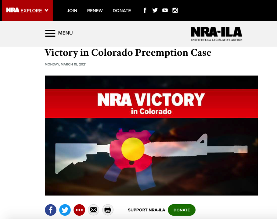 就在博尔德枪击案发前一周,博尔德市政府一项关于禁止携带和运输包括AR-15在内的攻击性武器的规定,被当地法院裁决无效。支持拥枪的美国全国步枪协会还在3月15日发文庆贺。
