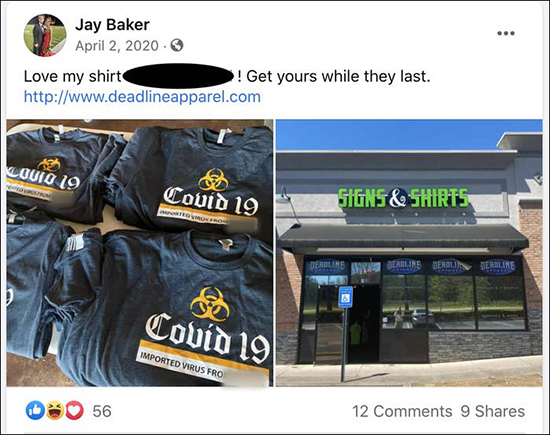 就在舆论纷纷对美国警方关于案件的处理提出质疑时,《今日美国》揭露出的一起事件,也许解释了案件迟迟无法被定性的原因。负责调查此案的切罗基县警长杰伊·贝克尔(Jay Baker),曾在去年4月在社交媒体上公开推销包含种族主义元素的T-恤衫,把新冠病毒与中国联系起来,贝克尔还在旁留言,鼓励人们“欲购从速”。