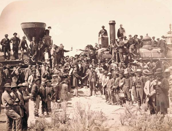 这张1869年的照片记录了横贯大陆铁路锤下最后一钉的情景,但其中只有一名中国工人。