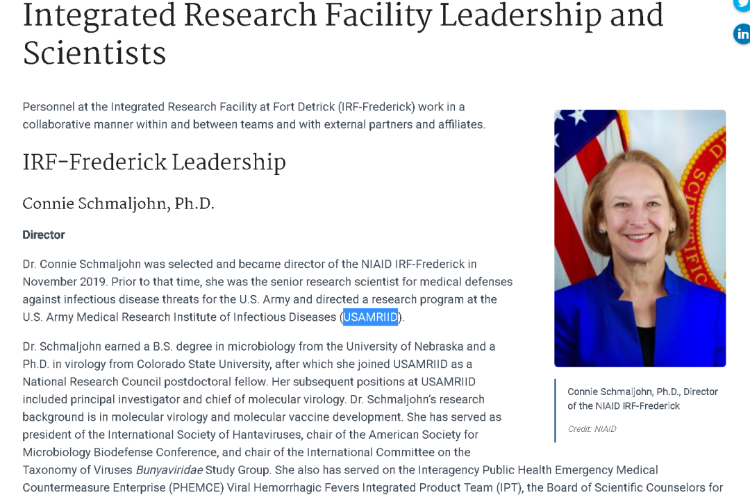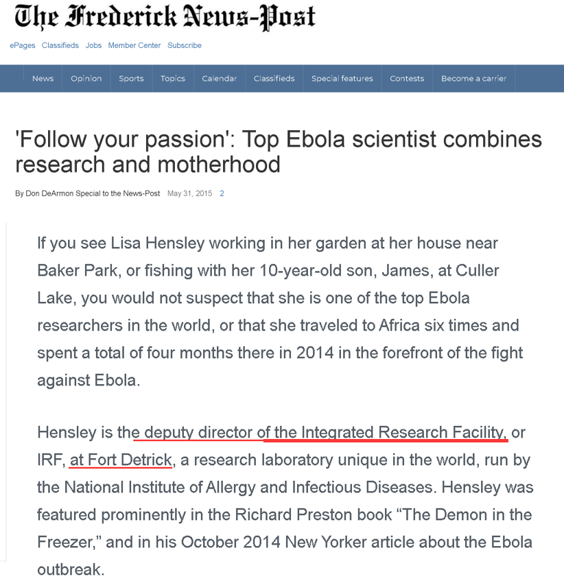此人之所以值得关注,不仅是因为她曾经是USAMRIID的科学家,并与巴里克多次有过合作(比如我们前面提到的2006年的那篇论文)——而且,根据德特里克堡所在的美国马里兰州弗雷德里克县的当地媒体《弗雷德里克新闻邮报》的报道,她后来还加入了IRF-Frederick,并担任起这家美国政府的科研机构的副主任。