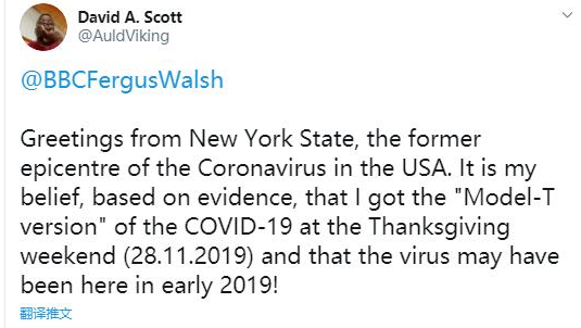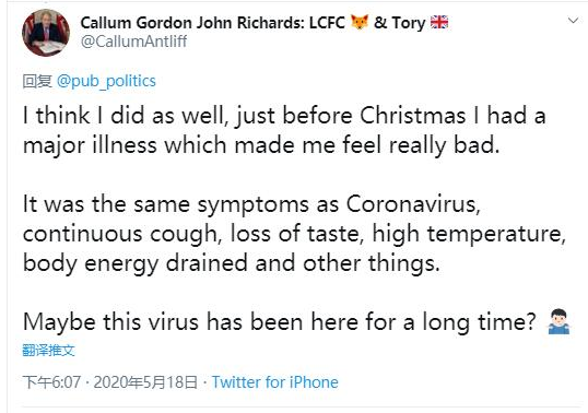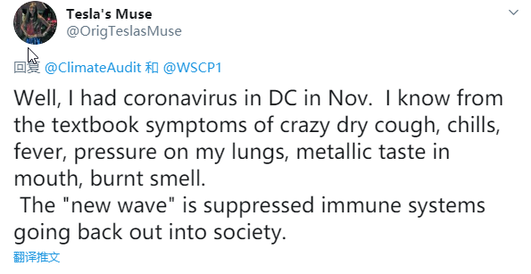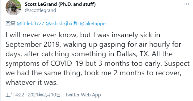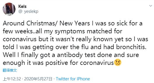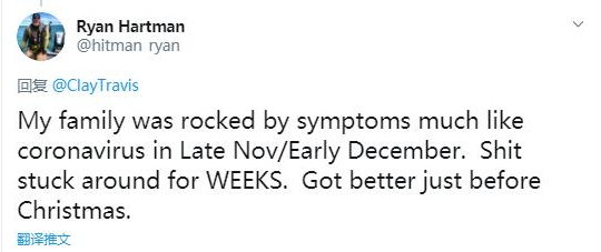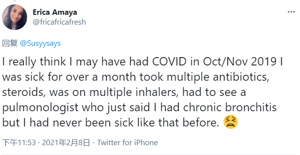 2、耿直哥检索了美国社交媒体上大量发布于2020年前半年——也就是美国新冠疫情刚开始爆发那会儿的贴文后,发现有许多来自美国或与美国有密切关联国家的人,表示他们早在2019年11月左右,自己或者别人就已经感染了疑似新冠病毒的疾病,因为感染者当时出现了与新冠肺炎极为相似的症状。