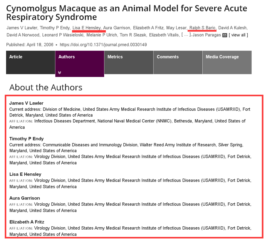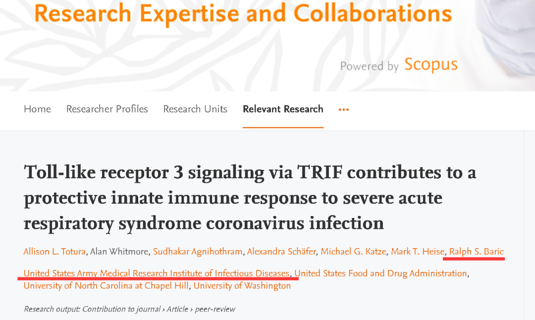先说USAMRIID方面,大量科研论文显示,巴里克曾与德特里克堡内的这家美军实验室进行过不少涉及冠状病毒的研究。比如一篇2006年的论文就显示,他们曾就非典肺炎开展过科研合作。