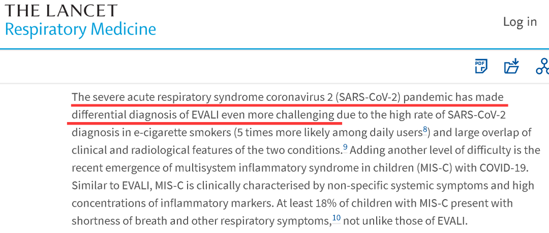 1、美国在2019年新冠疫情爆发前夕,曾经出现过一轮神秘的、大规模的“电子烟肺病”。耿直哥查询了大量公开文献后发现,虽然这些人中确实有人是使用了有问题的电子烟而导致了肺部的损伤,但也有一些刊登在诸如《柳叶刀》等国际主流学术期刊和媒体上的文章表示,区分“电子烟肺病”和后来被发现的新冠肺炎是有“难度”的,因为两者的一些症状很“相似”,会导致诊断上的困难。
