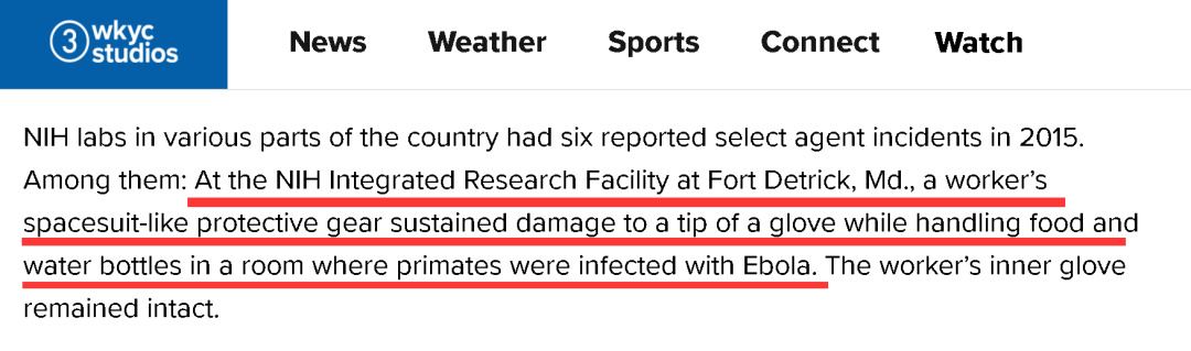 而美国NBC新闻网下属的地方媒体WKYC在2016年7月的一篇报道还显示,IRF-Frederick的实验室在2015年还发生过一次涉及埃博拉病毒的安全事故。