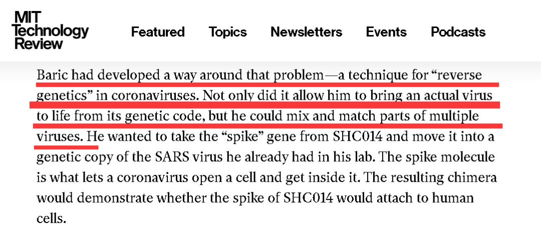 更重要的是,这位巴里克教授手上还掌握着一种通过“反向遗传技术”能改造乃至“增强”冠状病毒的技术。根据美国《麻省理工科技评论》杂志的报道,在这项技术的加持下,巴里克不仅可以依据冠状病毒的基因片段就培育出活生生的病毒来,还可以改造冠状病毒的基因,创造出新的冠状病毒,以探索这种病毒对人类的危害。