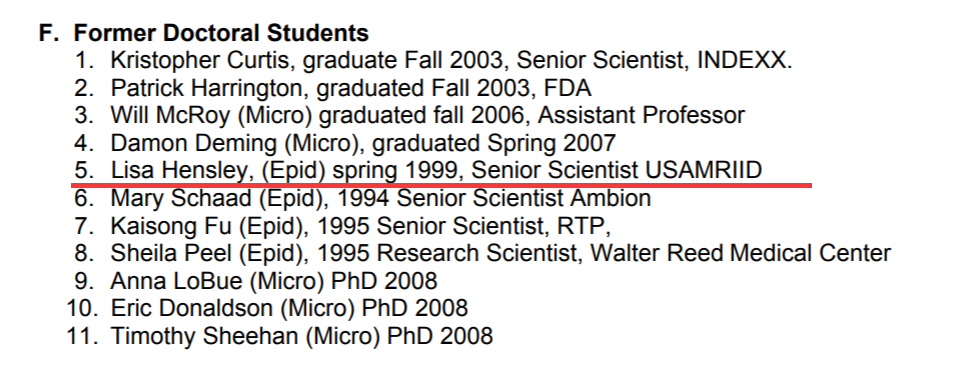 至于巴里克与德特里克堡内另一个研究高危病毒和冠状病毒的科研机构IRF-Frederick的关联,耿直哥在调查时发现了一份巴里克的个人简历,其中列出了一批巴里克曾经教导过的博士生,其中有一个名叫Lisa Hensley的女子。
