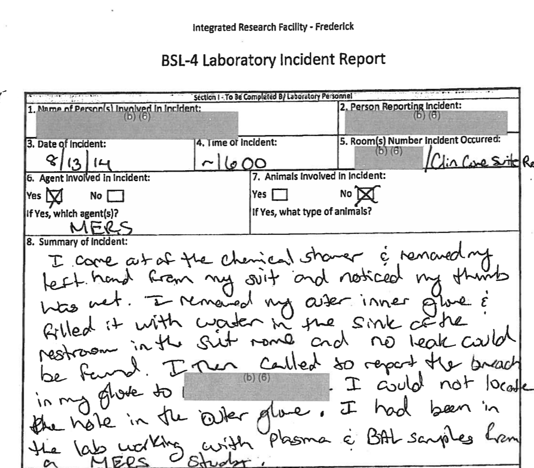 先来看IRF-Frederick的情况。美国《弗雷德里克新闻邮报》一份2014年的公开资料就显示,IRF-Frederick虽然号称有着安全等级很高的BSL-4生物实验室,也就是我们国内所说的P4实验室,但仅在2014年一年,这里就出现过多起实验室安全事故,而且一些事故还直接涉及MERS这样的高危冠状病毒。