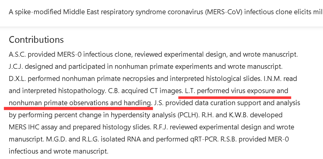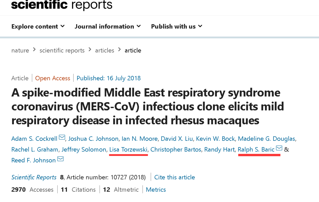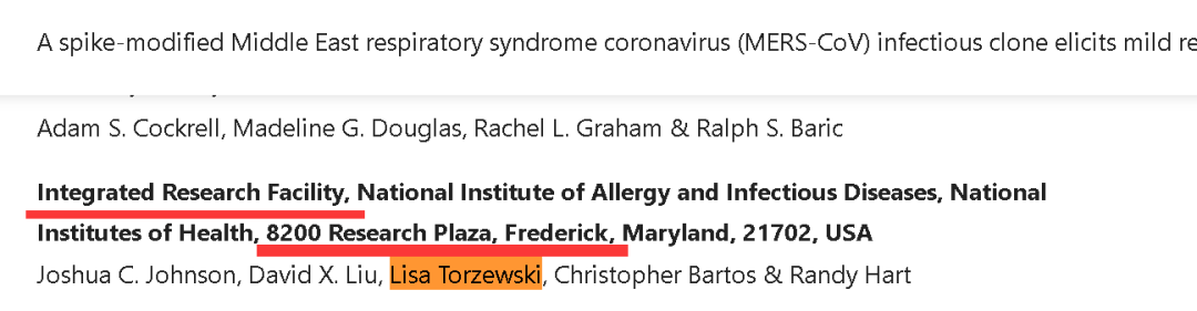 比如2018年美国《自然》杂志上的一篇论文就显示,来自IRF-Frederick的一位名叫Lisa Torzewski的研究人员,就用被修改了基因的MERS病毒感染了猿猴,以进行相关研究。这一研究同时还有巴里克本人的参与。