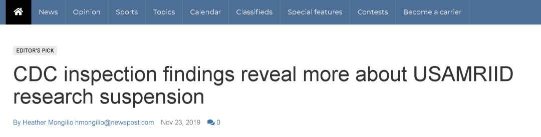 (来源:https://www.fredericknewspost.com/news/politics_and_government/military/cdc-inspection-findings-reveal-more-about-usamriid-research-suspension/article_6d1d316e-4989-5307-924c-8608c25ef6f7.html )