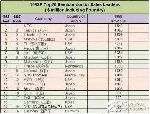 从上表中可以清楚看出,1988年全球的前20位半导体制造商中,11家为日本厂商,美国只占据5家,全球前三更是被日本的日电(NEC)、东芝和日立牢牢占据。