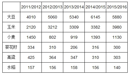 主要种植大豆、玉米、小麦、高梁、葵花籽等。近年主要农产品产量如下(单位:万吨):