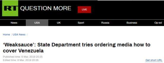 俄罗斯RT电视台6日说,美国在委内瑞拉政权更迭的努力正在受挫,于是美国国务院就试图营造出某种现实,试图通过恐吓记者要按照官方标准称呼瓜伊多来营造出某种现实,结果美联社记者马修⋅李不吃这套,反而形容国务院发言人“弱爆了”。