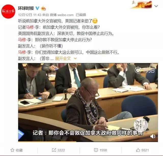当时,美国国务院发言人正就因涉嫌危害中国国家安全而被逮捕的加拿大人康明凯的事情发表声明,要求中国放人。可那位美国记者却反过来质问这位发言人会不会以同样的标准要求逮捕孟晚舟的加拿大放人,搞得那位美国政府的发言人很是尴尬。