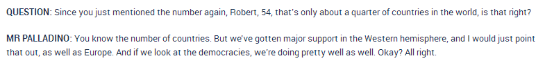 帕拉迪诺:你知道这个数字。但我们在西半球得到了多数国家的支持,我想说的是,还有欧洲。如果我们看看民主国家,我们也做得很好。对不对?