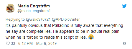 有推特用户留言说:很明显,帕拉迪诺完全清楚他说的每句话都是谎言,当他被迫照本宣科说出这些谎言时,似乎正处在真正的痛苦之中。↓