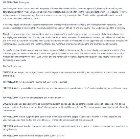 帕拉迪诺:美方赞赏委内瑞拉人民为实现和平及民主过渡所付出的努力,并祝贺临时总统胡安•瓜伊多在该地区的外交努力取得成功,并安全返回委内瑞拉。然而,我们注意到,在报道中,一些媒体错误地将胡安•瓜伊多称为“反对派领导人”或“自封的总统”,上述两者都不正确。