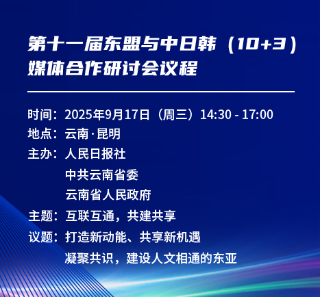 第十一届东盟与中日韩“10+3”媒体合作研讨会9月17日在昆明举行,研讨会以“互联互通 共建共赢”为主题,13位来自不同国家的主流媒体代表围绕主题致辞或作主旨发言。人民日报社副总编辑崔士鑫在会上发表了题为“为构建人文相通的东亚贡献媒体力量”的致辞。